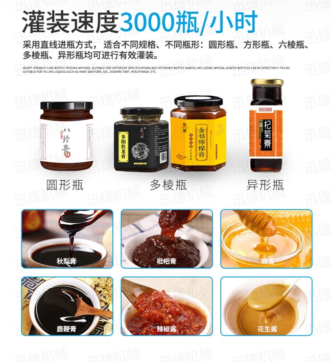 枇杷膏自動灌裝機(jī)生產(chǎn)流水線適用于各種1、各種膏滋如:秋梨膏、枇杷膏、鹿鞭膏、蜂蜜等的灌裝。2、調(diào)味醬如:香菇醬、辣椒醬、豆瓣醬、花生醬、芝麻醬、牛油火鍋底料、紅油火鍋底料。3、采用多規(guī)格的灌裝轉(zhuǎn)閥、灌裝頭,可適應(yīng)不同客戶物料的灌裝需求。