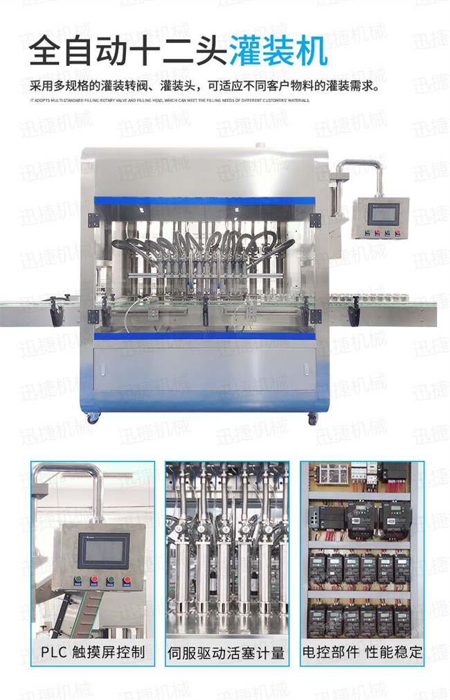 2、灌裝機(jī)以進(jìn)口PLC電腦控制、伺服驅(qū)動計量,全彩色觸摸屏人機(jī)界面,一鍵完成計量切換確保容量之調(diào)整簡易、快捷、準(zhǔn)確。是任何形式的灌裝機(jī)無法替代的;