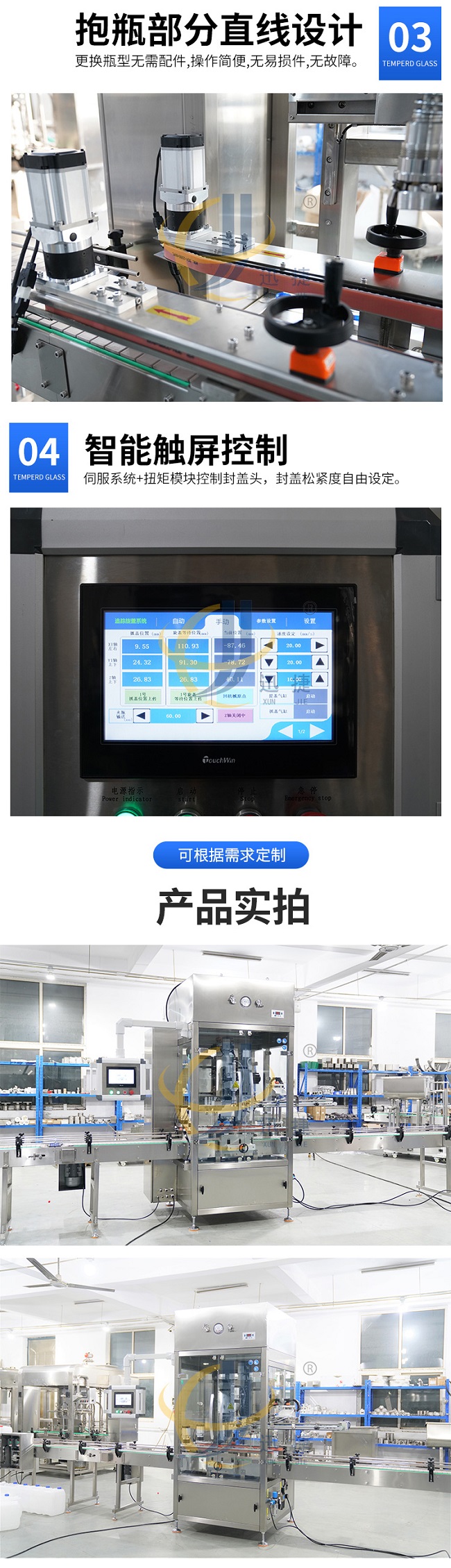 跟蹤式旋蓋機是在聯機取放旋蓋機的基礎上設計的,它解決了聯機拾放旋蓋機容量低的問題,其運動由運動控制器控制,比PLC更、更準確,封蓋時,封蓋頭隨著瓶子的移動而移動。它可以配備一個或兩個封蓋頭,容量從 40B/M 到70B/M 無需考慮瓶子和蓋子的大?。ɑ?100ML到5000ML瓶子)。