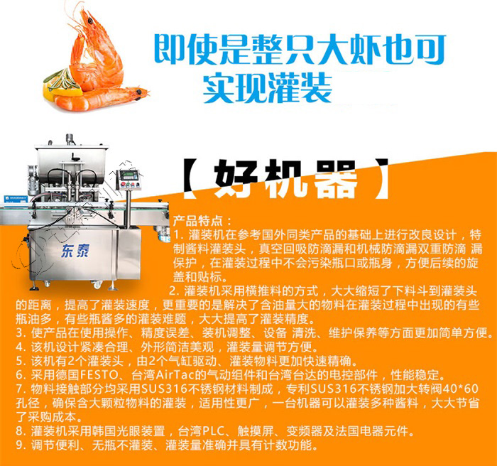 該系列灌裝機采用活塞式氣缸氣動原理,適用于調味品中帶顆粒并且濃度較大的香菇醬、辣椒醬、豆瓣醬、花生醬、芝麻醬、果醬、牛油火鍋底料、紅油火鍋底料等較為粘稠醬類的灌裝。灌裝轉閥可以很具客戶物料定做加大,以適應不同客戶物料的灌裝需求。