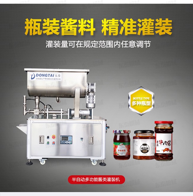 辣椒醬灌裝機是由我公司自主研發,臥式攪拌,可以很好的解決大顆粒物料灌裝過程中油料分離過快而導致的灌裝誤差大等難題。主要適用于粘稠醬料,如麻辣醬、香辣醬、牛肉醬、豆辨醬、黃豆醬、豆豉醬等醬料產品。在包裝過程中,海鮮醬灌裝機可以實現產品從原料進入到包裝機械開始,經過一些列生產活動構成的路線,從而達到無人化自動包裝。如果您有需要,可以和我們聯系