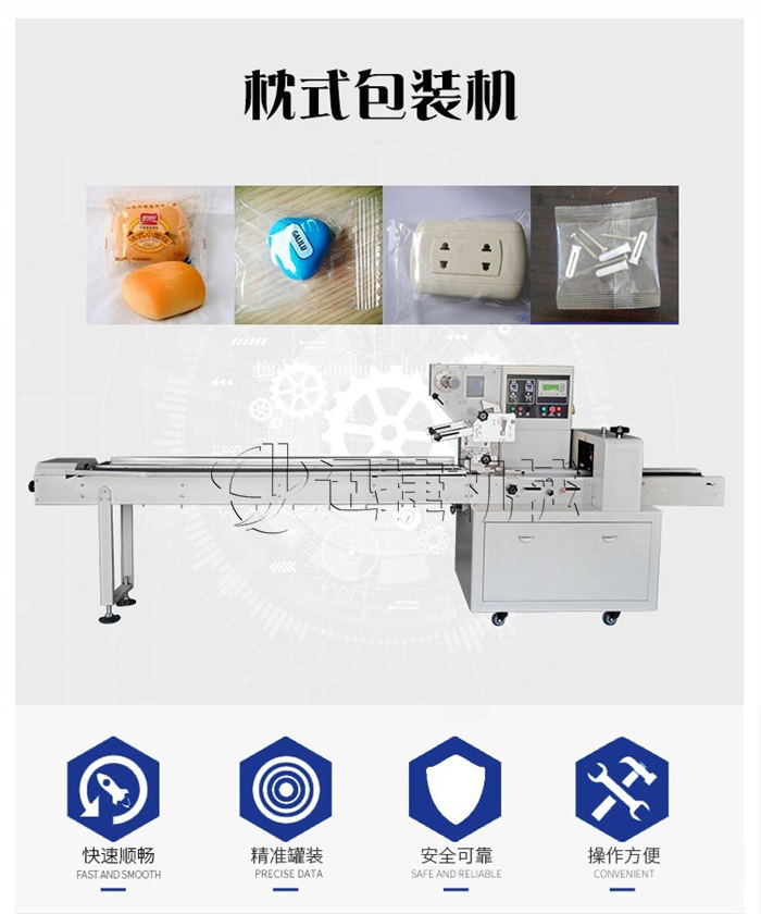 該包裝機為全自動枕式包裝機,適用于各種固型產品的包裝,如食品類(方便面、面包、漢堡、餅干、雪糕、冷凍食品),日用品(肥皂、餐巾紙),五金配件,機械零件(軸承),橡膠制品(輪胎)等產品的枕式包裝。